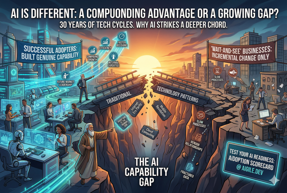 Third, AI is for the first time creating a meaningful capability gap between businesses that adopt it well and those that don't at the level of everyday operational work. Previous technology waves largely created parity — when everyone has a website, having a website doesn't differentiate you. AI, done well, builds into a compounding advantage: better processes, better decisions, better products, delivered faster, at lower cost. That gap, once established, is hard to close.